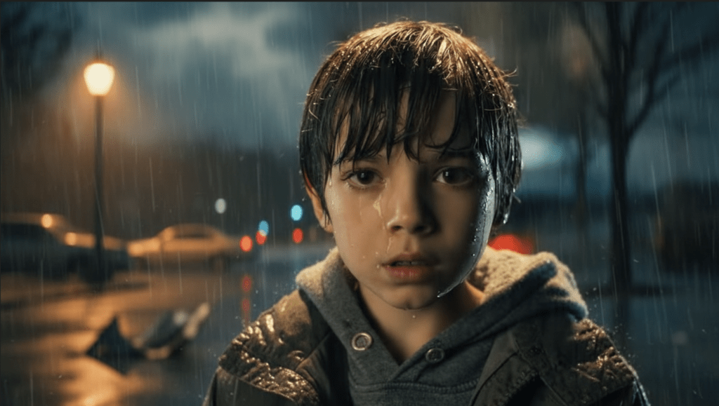 A man in a dark formal coat, tall and composed, paused beside him. His umbrella shielded him from the storm, but his eyes—gentle, observant—focused solely on the trembling child.