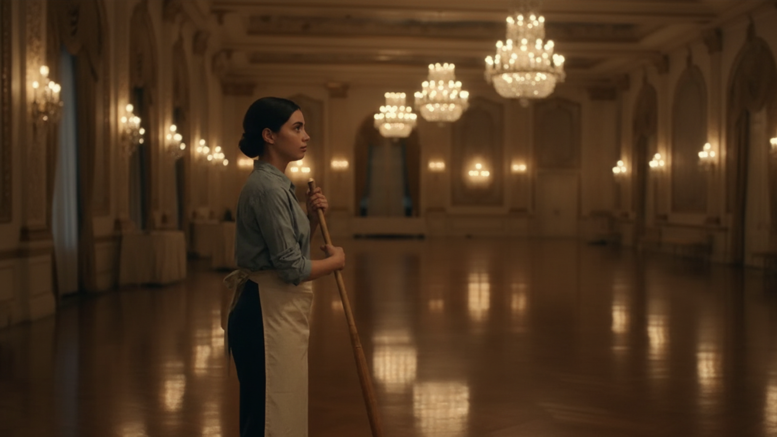 The grand ballroom of the Hotel Imperiale dazzled like a palace of dreams, with crystal chandeliers casting a golden glow over the elegantly dressed elite. Amidst the glamour, Clara, the unassuming cleaning lady, clutched her broom, enduring the invisible sneers of those around her for five long years.
