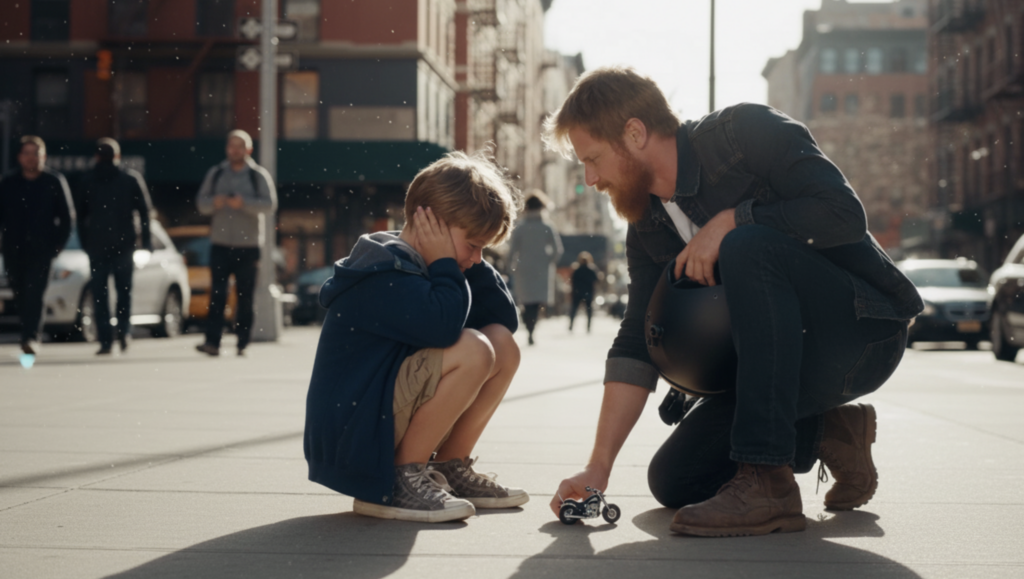 A child’s panic echoed through the street… But a biker’s quiet strength changed everything.