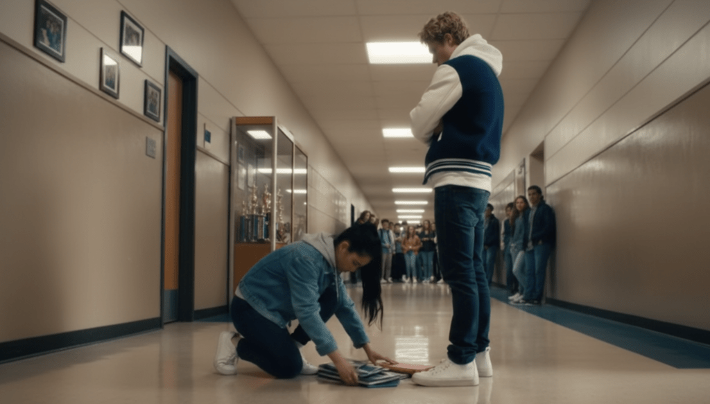 “Move it, freak,” Tyler sneered, shoving past her in the crowded gym hallway after school. His letterman jacket caught her shoulder, sending her books scattering.