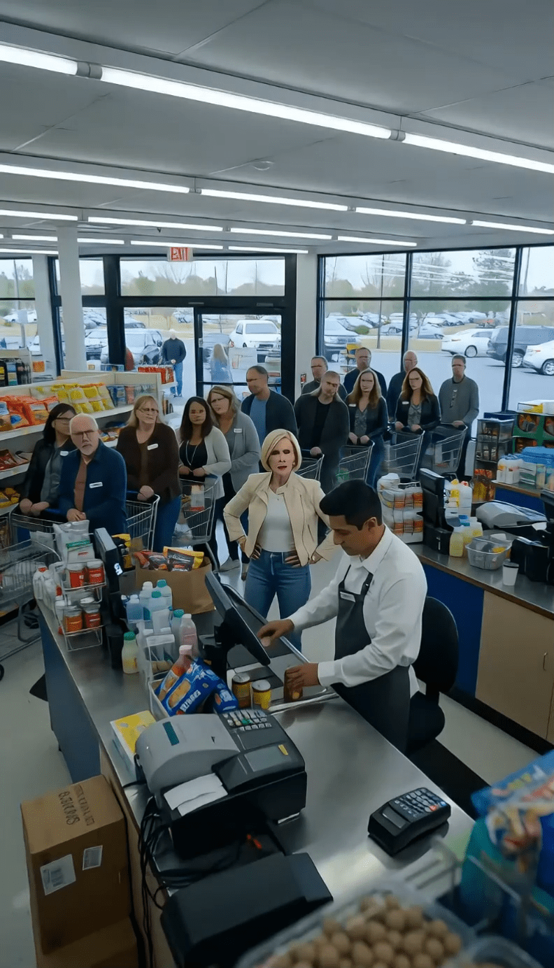 The customers behind her shifted uncomfortably. Emma, the teenage cashier, looked mortified.